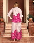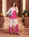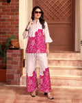 Elevate your everyday style with this premium floral printed women’s co-ord set, featuring a soft cream base beautifully contrasted with vibrant magenta floral patterns. The set includes a stylish straight-cut top with a modern neckline and 3/4th bell sleeves, paired with wide-leg trousers for ultimate comfort and chic appeal. Perfect for casual outings, office wear, brunch dates, and festive gatherings, this outfit blends elegance with ease. Crafted from soft, breathable fabric, it ensures all-day comfort while making you stand out with its unique design.