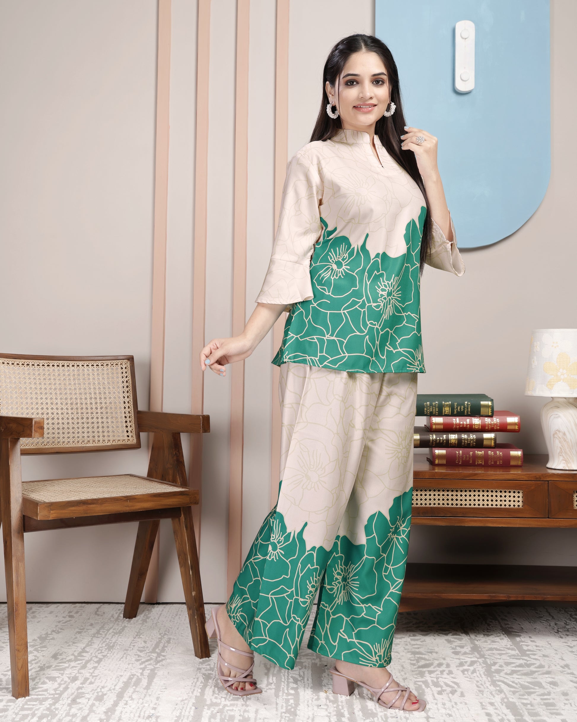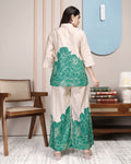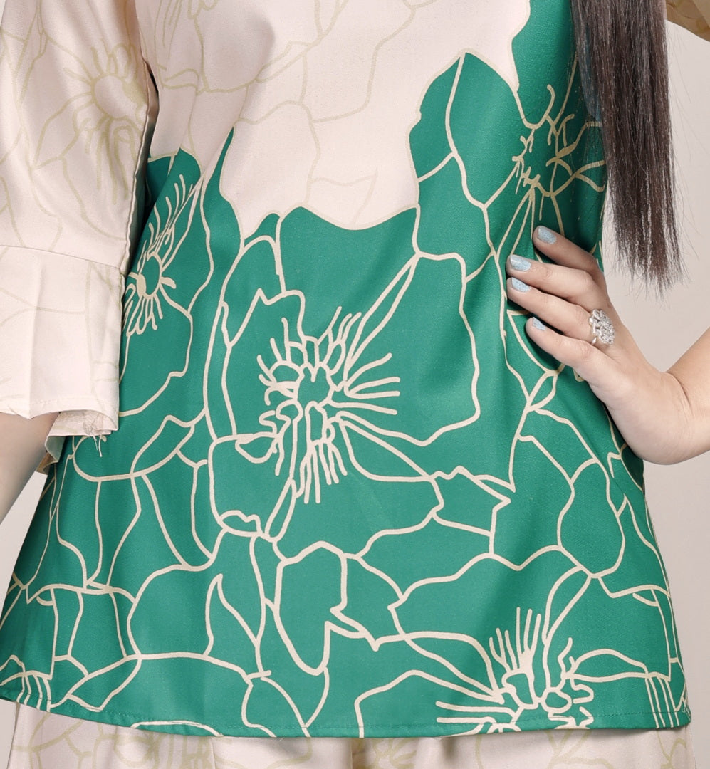 Elevate your everyday style with this premium floral printed women’s co-ord set, featuring a soft cream base beautifully contrasted with vibrant magenta floral patterns. The set includes a stylish straight-cut top with a modern neckline and 3/4th bell sleeves, paired with wide-leg trousers for ultimate comfort and chic appeal. Perfect for casual outings, office wear, brunch dates, and festive gatherings, this outfit blends elegance with ease. Crafted from soft, breathable fabric, it ensures all-day comfort while making you stand out with its unique design.