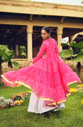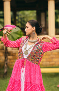 Women's Ethnic Pink Bandhani Anarkali with Embroidered Mirror Work Jacket & White Lehenga